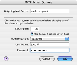 6. VERY IMPORTANT! Do not enter your current password! Why? Because it will be transmitted over the internet unencrypted, and someone could get it from you! We need to setup some things before it will be encrypted. Enter an incorrect password here. You will occasionally get a dialog box requesting your password when mail attempts to check your mail. Ignore it until you finish setting up the secure connections. Just hit cancel when these messages appear.
